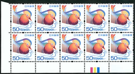 通常切手 オシドリ 50円 10枚カラーマーク下付き