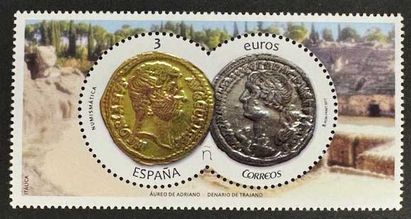 貨幣学会2017年 古代ローマ・ハドリアヌス帝のアウレウス金貨とトラヤヌス帝のデナリウス銀貨 スペイン発行
