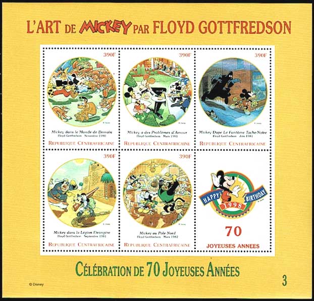ディズニー ミッキーマウス(フロイド・ゴットフレッドソン画 No.3) 切手小型シート 中央アフリカ共和国発行