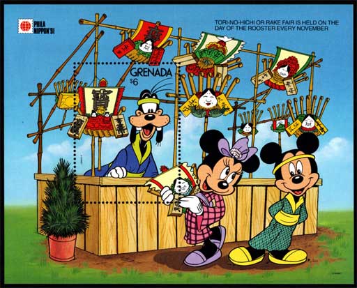ディズニー 酉の市 日本国際切手展'91 切手小型シート グレナダ発行