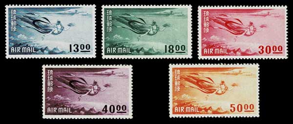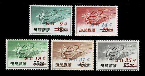琉球切手 第3次航空切手 天女 米貨単位改訂加刷 全揃い5種セット