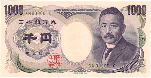 珍番号 夏目漱石千円 緑2桁 XM000001Q番 財務省 未使用