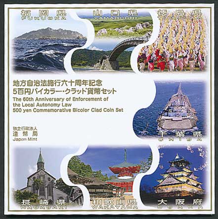 商品:地方自治法施行60周年記念 5百円バイカラー・クラッド(福岡県、山口県、徳島県、千葉県、大阪府、和歌山県、長崎県)7点
