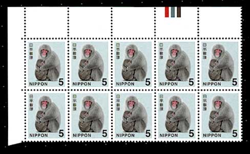 通常切手 新日本の自然 ニホンザル 5円 10枚ブロックカラーマーク左上