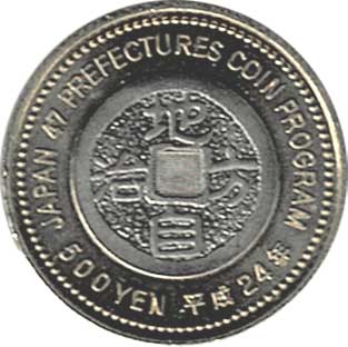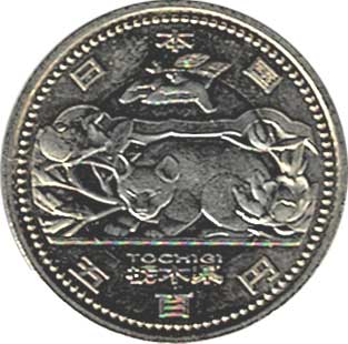 地方自治法施行60周年記念500円バイカラー・クラッド(栃木県) 日本貨幣カタログ番号:07-123 直径:26.5ミリ 品位:銅750/亜鉛125/ニッケル125 量目:7.1g 発行数:1,800,000枚 発行:平成25年1月16日 図案:眠り猫と雀 異形斜めギザ、潜像等