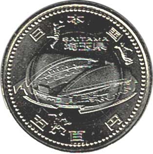 地方自治法施行60周年記念500円バイカラー・クラッド(埼玉県) 日本貨幣カタログ番号:07-137 直径:26.5ミリ 品位:銅750/亜鉛125/ニッケル125 量目:7.1g 発行数:1,780,000枚 発行:平成27年1月21日 図案:埼玉スタジアム2002 異形斜めギザ、潜像等