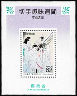 日本切手カタログ番号:記1296S/S 発行日:平成2年4月20日(1990年) 発行枚数:200万枚 状態:未使用・美品 額面:62円 図柄:星を見る女性(太田聴雨)