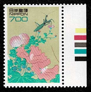 通常切手 四季花鳥図 かまきり 700円切手単片2種 カラーマーク右付きと銘版セット