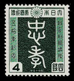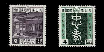 日本切手カタログ番号:記83~84 発行日:昭和15年10月25日(1940年) 額面:発行枚数 2銭 582万枚 4銭 559万枚 状態:未使用・美品 図柄:勅語下賜の図、忠孝の文字