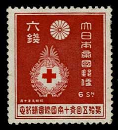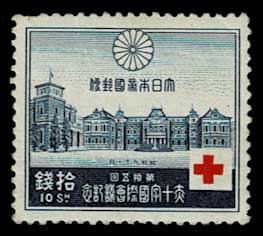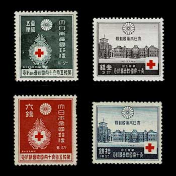日本切手カタログ番号:記57~60 発行日:昭和9年10月1日(1934年) 額面:発行枚数 1銭5厘 238.9万枚 3銭 232.9万枚 6銭 59万枚 10銭 59万枚 状態:未使用・難あり 図柄:日本赤十字社章、日本赤十字社