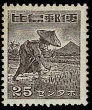 図柄:ニッパハウス、田植え、マヨン山と富士、帆船