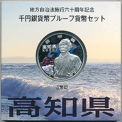 地方自治法施行60周年記念千円銀貨幣プルーフ貨幣セット(高知県) 日本貨幣カタログ番号:07-8A 直径:40ミリ 素材:純銀(99.9%) 量目:31.1g 発行枚数:10万枚(ABCセット全体で) 発行:平成22年(2010年) 図案:表 坂本竜馬・裏 雪月花