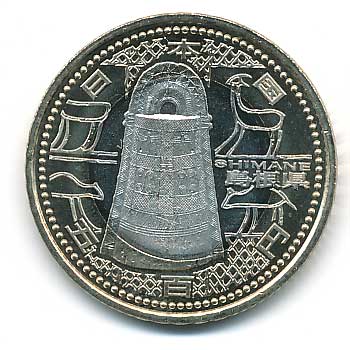 地方自治法施行60周年記念500円バイカラー・クラッド(島根県) 日本貨幣カタログ番号:07-103 直径:26.5mm 品位:銅750/亜鉛125/ニッケル125 量目:7.1g 発行:平成20年12月10日 発行数:1,970,000枚 状態:未使用 図案:銅鐸とその文様・絵画