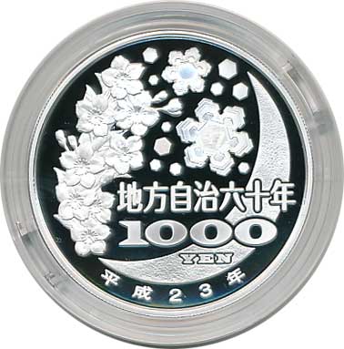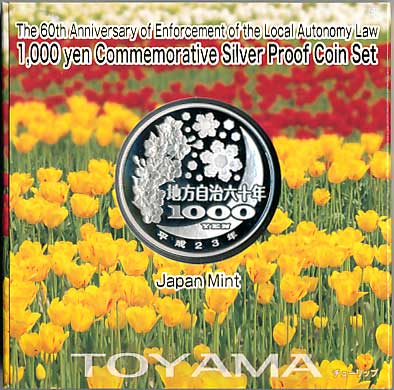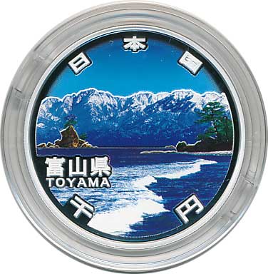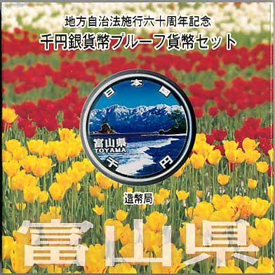 地方自治法施行60周年記念千円銀貨幣プルーフ貨幣セット(富山県) 日本貨幣カタログ番号:07-14A 直径:40ミリ 素材:純銀(99.9%) 量目:31.1g 発行枚数:10万枚(ABCセット全体で) 発行:平成23年(2011年) 図案:表面:海越しの立山連峰・裏 雪月花