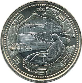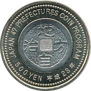 地方自治法施行60周年記念500円バイカラー・クラッド(岩手県) 日本貨幣カタログ番号:07-118 直径:26.5mm 品位:銅750/亜鉛125/ニッケル125 量目:7.1g 発行数:1,790,000枚 発行:平成24年1月18日 図案:中尊寺金色堂新覆堂と毛越寺曲水の宴