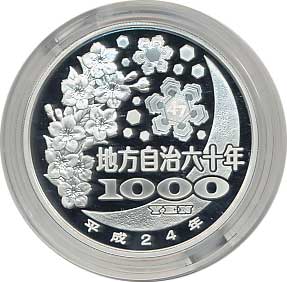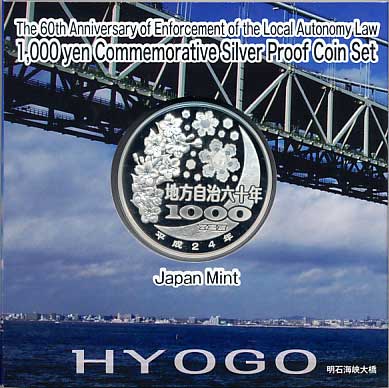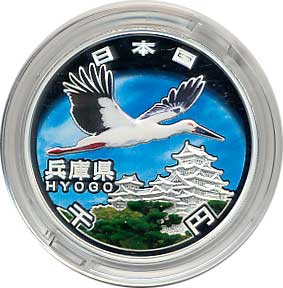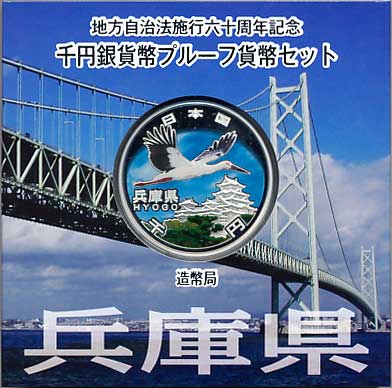 地方自治法施行60周年記念千円銀貨幣プルーフ貨幣セット(兵庫県) 日本貨幣カタログ番号:07-25A 直径:40ミリ 素材:純銀(99.9%) 量目:31.1g 発行枚数:10万枚(ABCセット全体で) 発行:平成25年(2013年) 図案:表 コウノトリと姫路城・裏 雪月花
