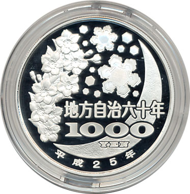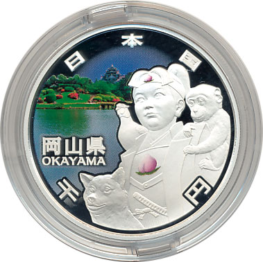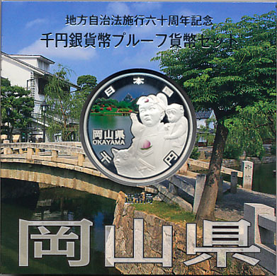 地方自治法施行60周年記念千円銀貨幣プルーフ貨幣セット(岡山県) 日本貨幣カタログ番号:07-28A 直径:40ミリ 素材:純銀(99.9%) 量目:31.1g 発行枚数:10万枚(A・B・C含む) 発行:平成25年(2013年) 図案:表 岡山後楽園と桃太郎・裏 雪月花
